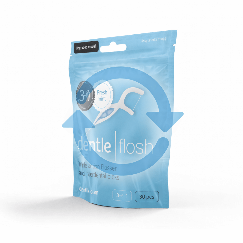 Dentle Flosh is not a dental floss or a interdental brush – it is both! The floss pick is easier to use than regular floss and the interdental brush is perfect for you with bridge structures, implants or braces.